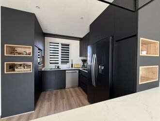 Une cuisine moderne entièrement équipée, ouverte et conviviale.